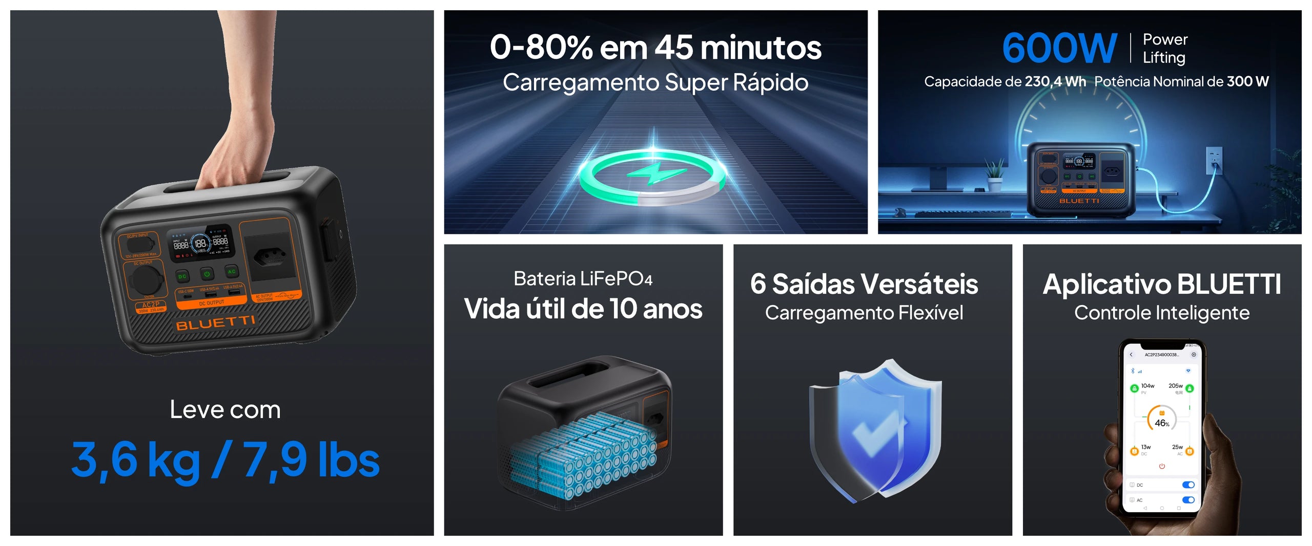 O BLUETTI AC2P é uma solução de armazenamento de energia extraordinariamente leve e fácil de usar. Com uma capacidade de 230 Wh e uma potência de saída de 300 W, ele pode atender à maioria das necessidades de energia dos dispositivos essenciais. Carrega até 80% da capacidade em apenas 45 minutos, tornando-o o companheiro perfeito para atividades ao ar livre, socorro de emergência, viagens de RV e muito mais.