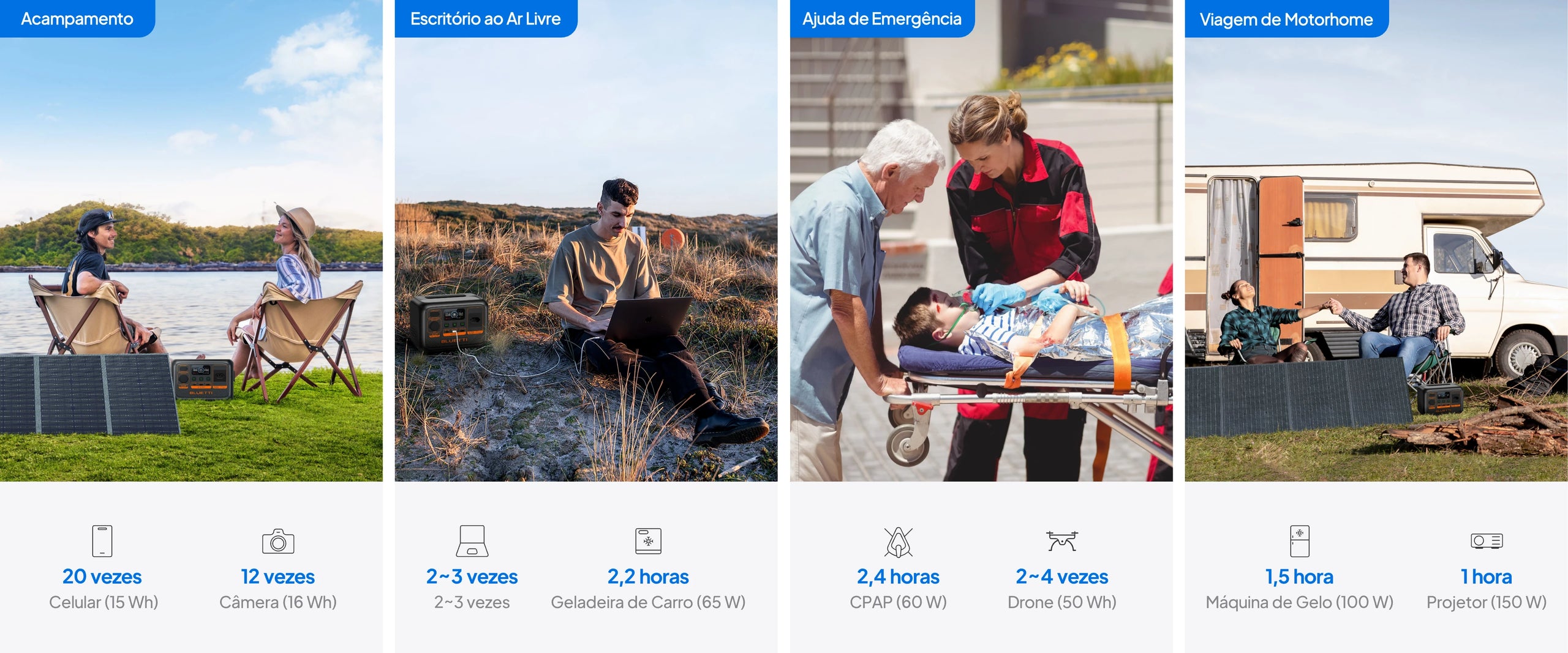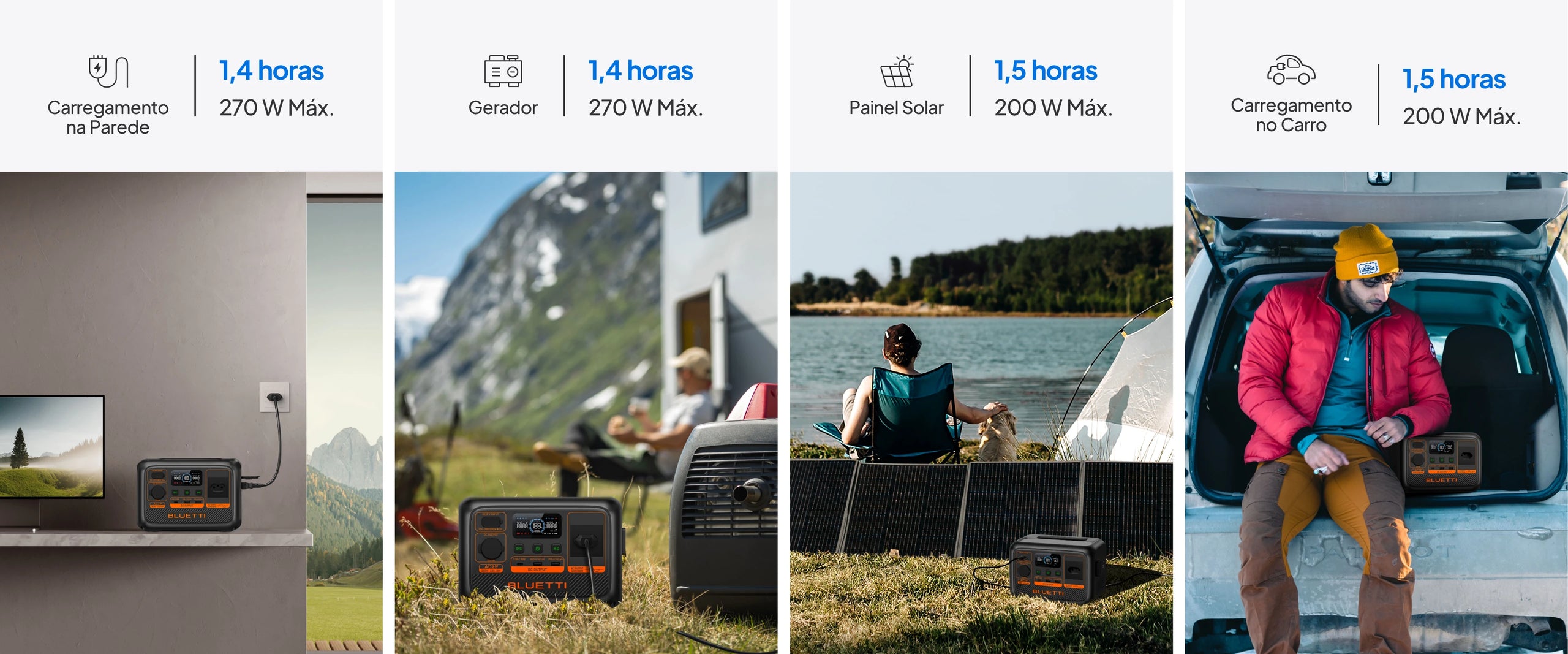 Carregue de forma eficiente que preferir - através de uma tomada AC, painéis solares, gerador ou até mesmo um carregador de carro enquanto você está dirigindo, sem precisar se preocupar com a bateria acabando quando estiver a quilômetros de distância da rede elétrica.