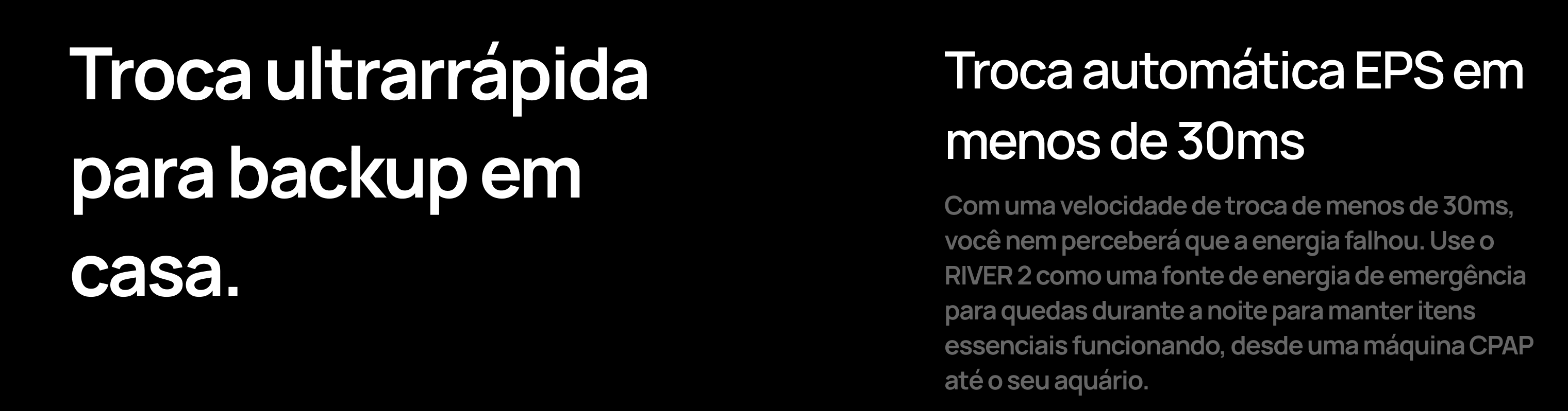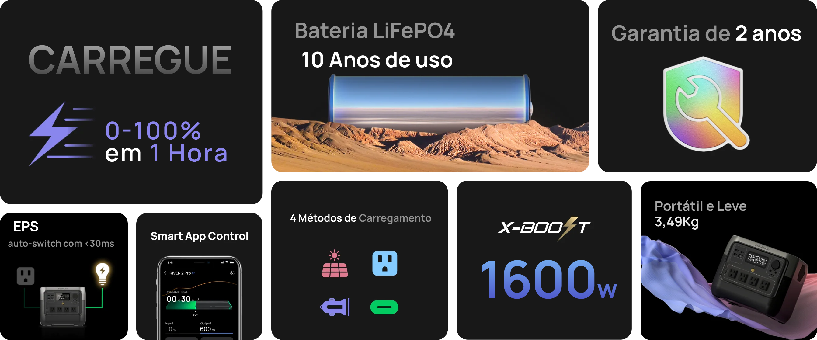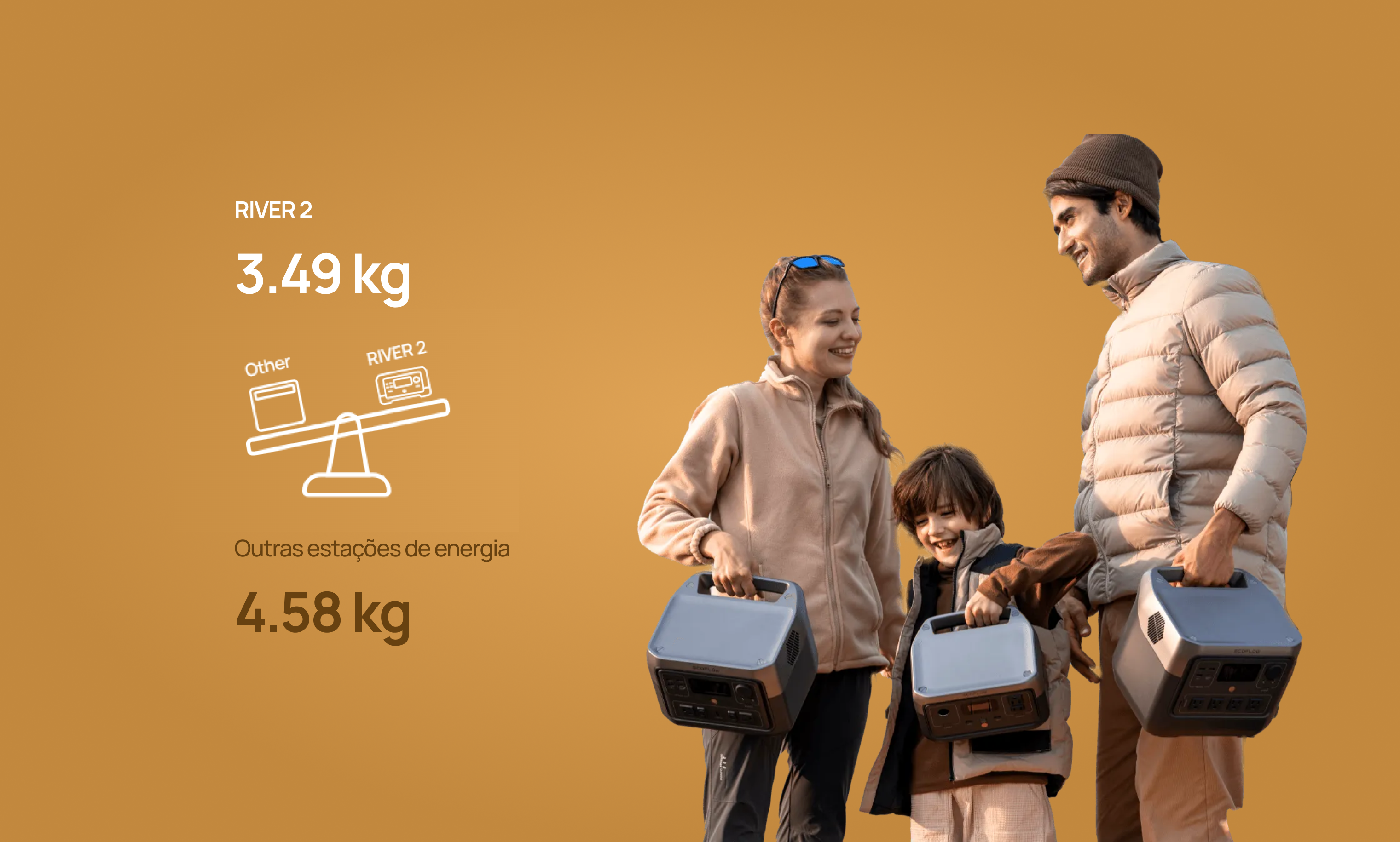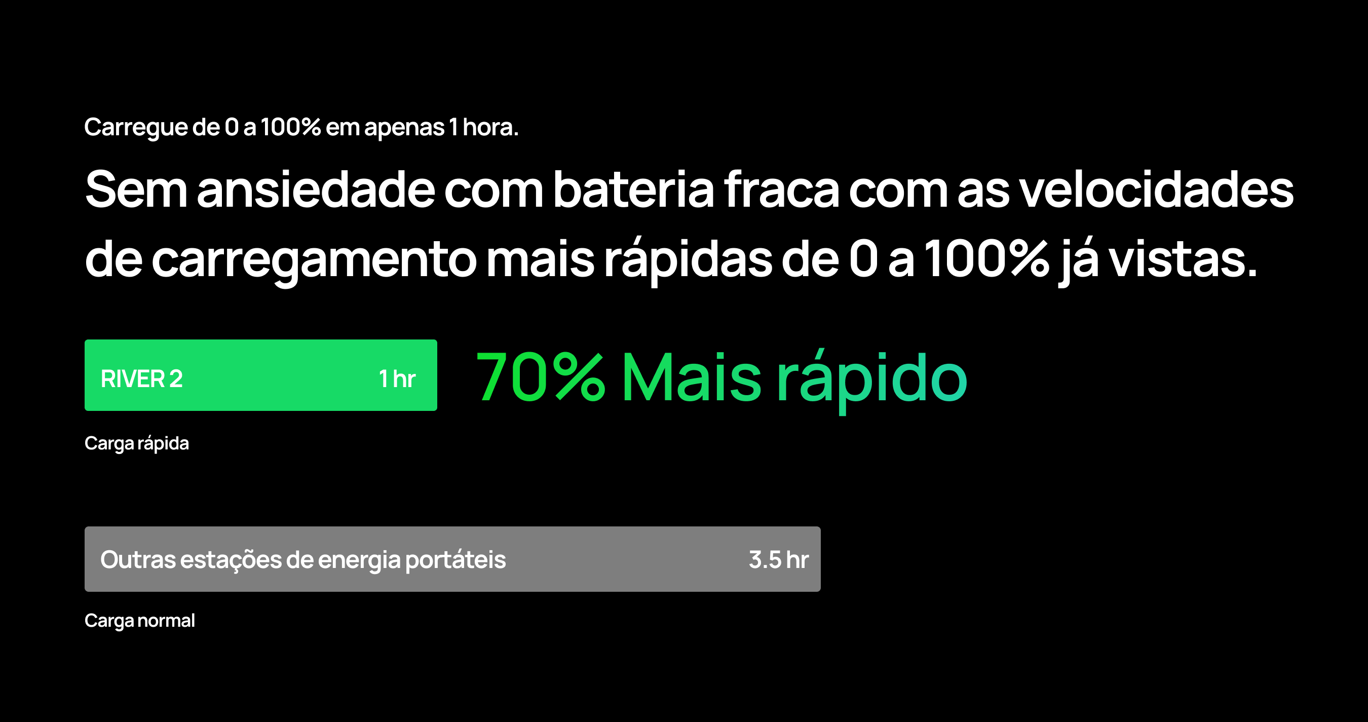 O RIVER 2 supera o padrão de velocidade de carregamento da indústria, carregando completamente em apenas 60 minutos*¹. Isso é 70% mais rápido do que outras estações de energia portáteis no mercado e 38% mais rápido do que gerações anteriores. Carregue completamente o RIVER 2 enquanto você arruma suas malas, para que você esteja sempre pronto para uma viagem de última hora.