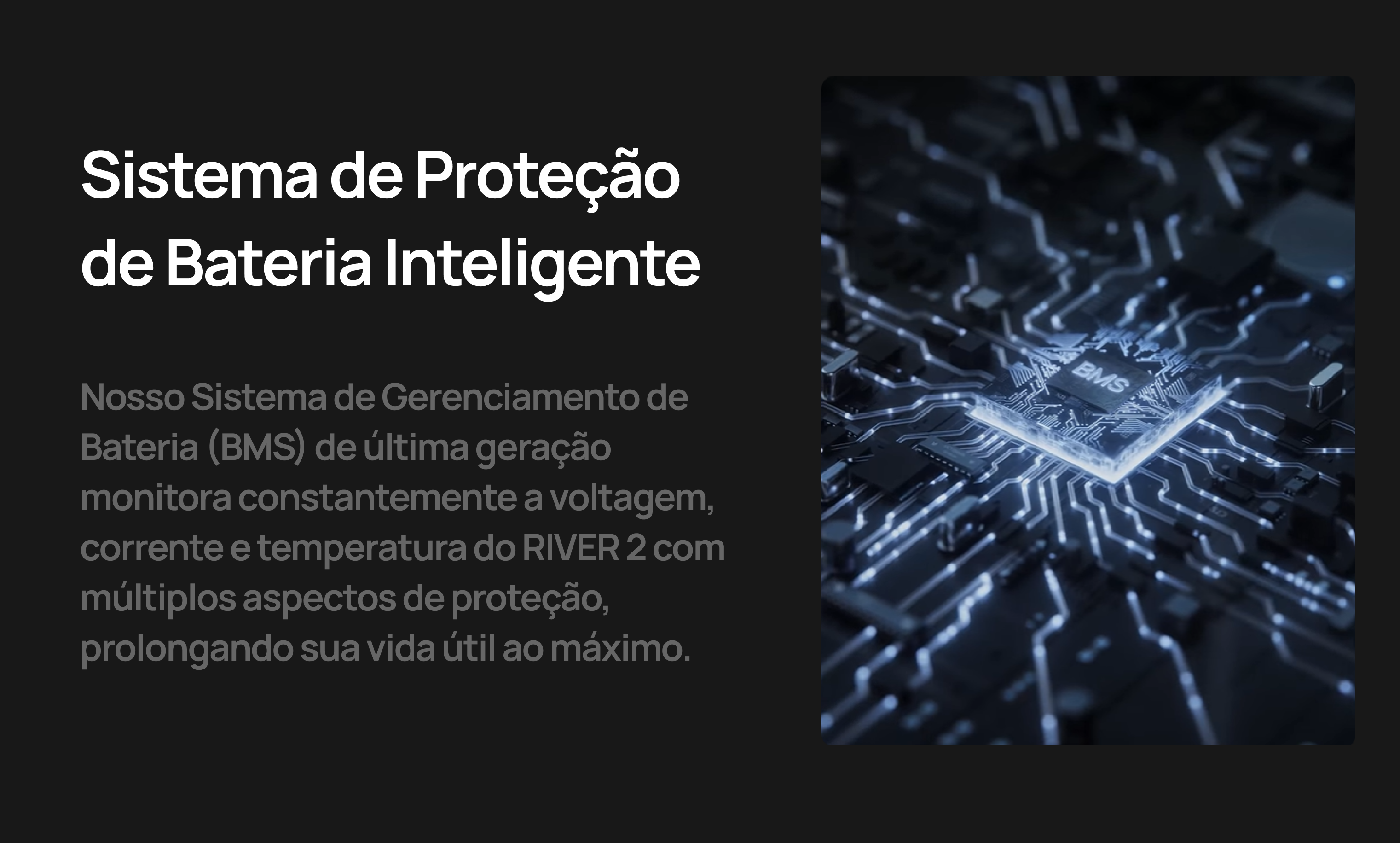 Sem aumentar a temperatura da bateria, a tecnologia de carregamento rápido do RIVER 2 não danifica a bateria. É a primeira estação de energia portátil do mundo a obter a certificação TÜV Rheinland, cumprindo mais de 20 critérios de alto nível.